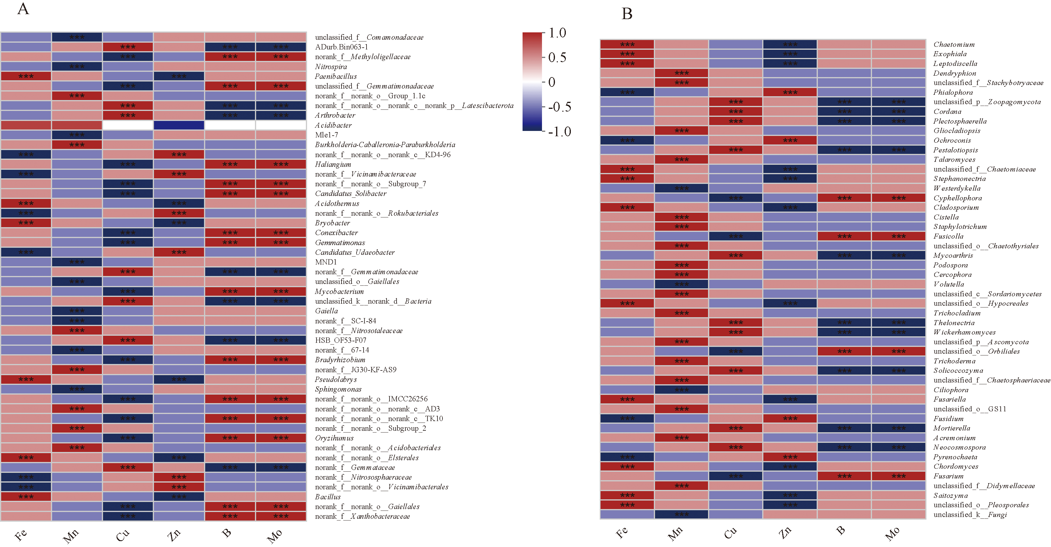 本研究以浙江省台州市黄岩区不同树种套种菜头肾(Strobilanthes sarcorrhiza)的土壤为研究对象,分析了不同套种组合下土壤中有效态微量元素的差异,采用高通量测序技术探讨了不同套种组合对微生物群落结构的影响。结果表明:枇杷林地套种菜头肾后,随着种植年限的增加,土壤有效铁含量从79.83 mg·kg-1显著(p<0.05)上升至155.33 mg·kg-1,而有效锌含量从5.57 mg·kg-1显著下降至3.90 mg·kg-1。主坐标分析(PCoA)与非度量多维尺度(NMDS)的结果表明,不同套种组合的土壤微生物结构存在差异,说明不同的套种方式能够改变土壤微生物的组成。相关分析的结果表明,土壤特定微生物的相对丰度与土壤有效态微量元素含量之间存在显著相关性。