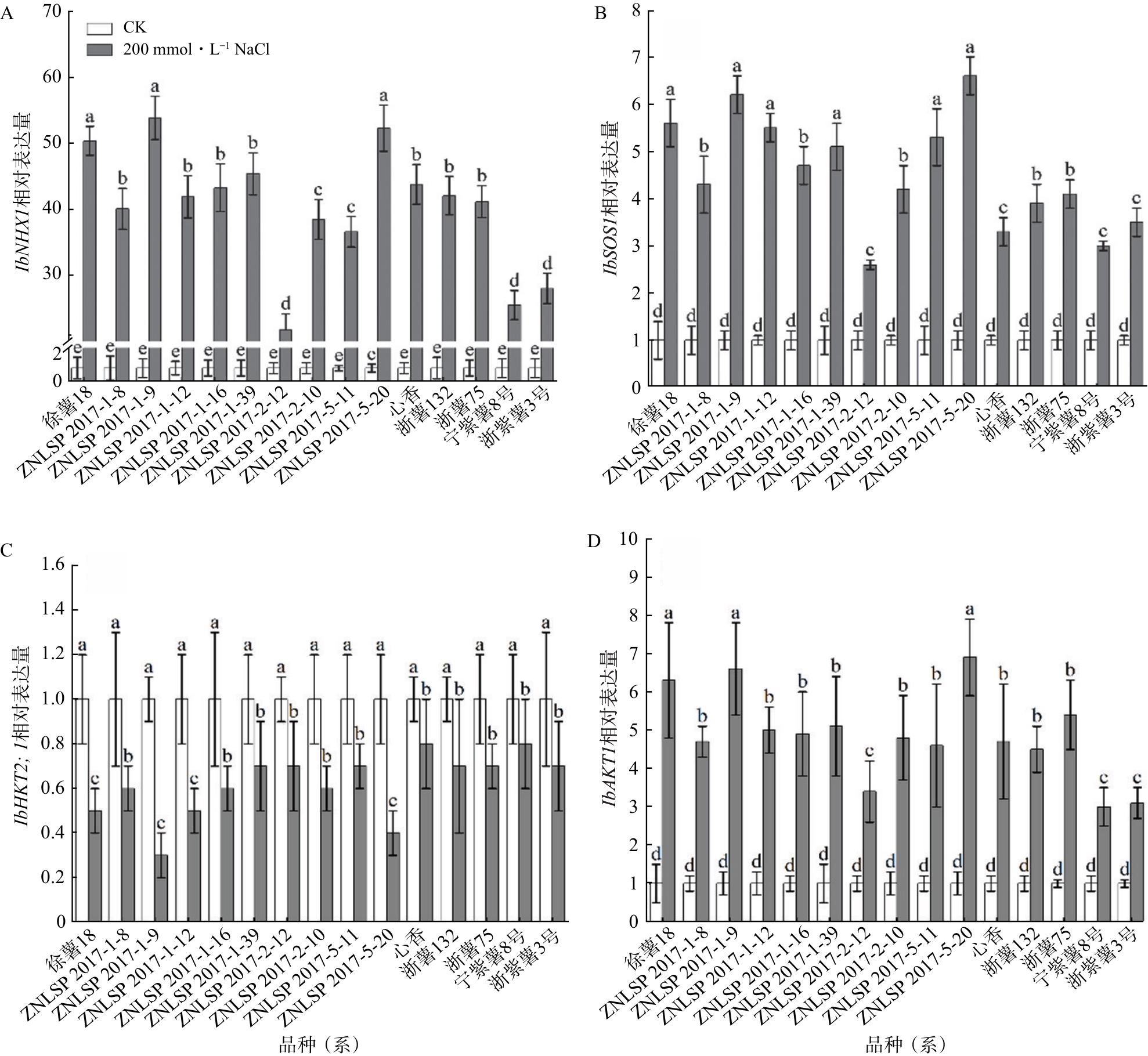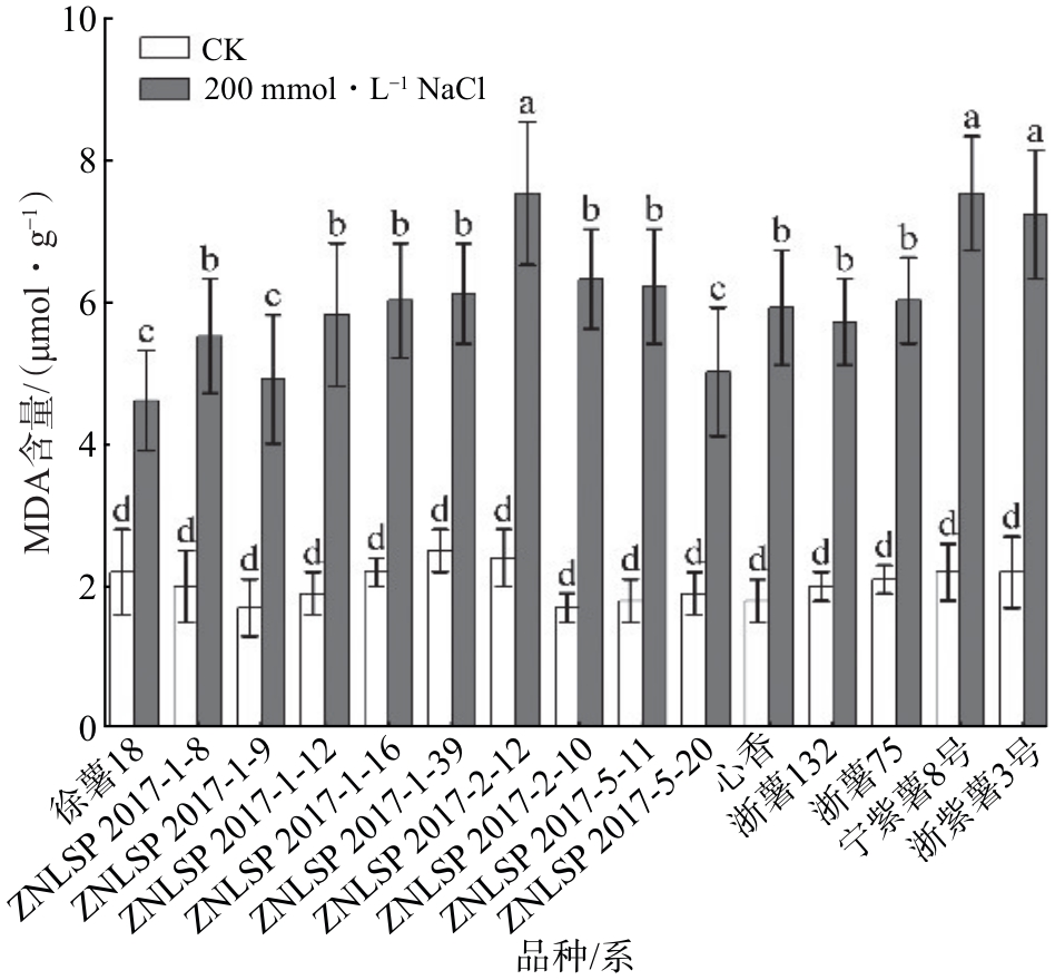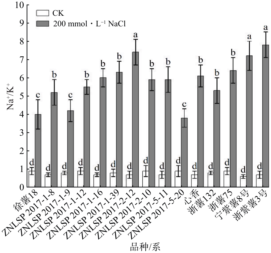 为筛选出不同耐盐性的甘薯材料,本研究选取15个甘薯品种(系)为试验材料,通过测定其抗氧化酶活性、光合参数和相关盐胁迫响应基因表达量等指标,探究盐胁迫对甘薯生理生化的影响。结果表明,在200 mmol·L-1 NaCl处理下,与对照相比,不同甘薯品种(系)的超氧化物歧化酶(SOD)活性、丙二醛(MDA)含量、Na+/K+均显著增加,净光合速率、蒸腾速率和气孔导度均显著下降,15个品种(系)的IbSOS1IbNHX1IbAKT1基因表达量显著高于对照,而IbHKT2;1基因的表达量则呈相反结果。同时,超微结构观察结果显示,盐胁迫下甘薯叶片细胞的细胞壁变薄缺失,线粒体结构损伤严重,叶绿体结构变形,基粒片层减少,内部淀粉粒变大。综合以上结果分析,15个品种(系)的耐盐性可分为3类,第一类包含徐薯18、ZNLSP2017-1-9和ZNLSP2017-5-20等3个耐盐品种(系);第二类包含ZNLSP2017-1-8、ZNLSP2017-1-12、ZNLSP2017-1-16、ZNLSP2017-1-39、ZNLSP2017-2-10、ZNLSP2017-5-11、心香、浙薯132和浙薯75等9个中等耐盐品种(系);第三类包含ZNLSP2017-2-12、宁紫薯8号和浙紫薯3号等3个不耐盐品种(系)。本研究可为甘薯耐盐新品种的选育提供种质资源,并为甘薯苗期耐盐性评价提供理论依据。