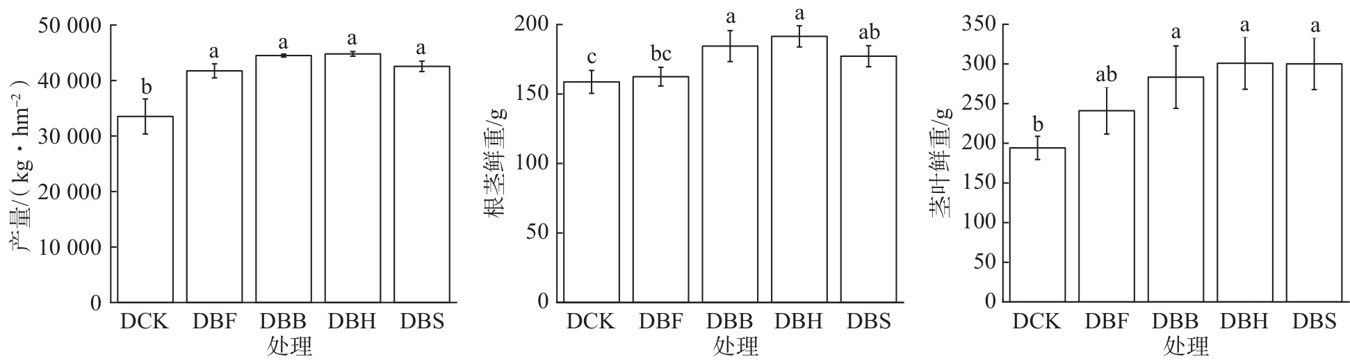 图2 不同处理下生姜茎叶鲜重、根茎鲜重和产量根茎鲜重和茎叶鲜重均为10株生姜混合样品所对应的值。