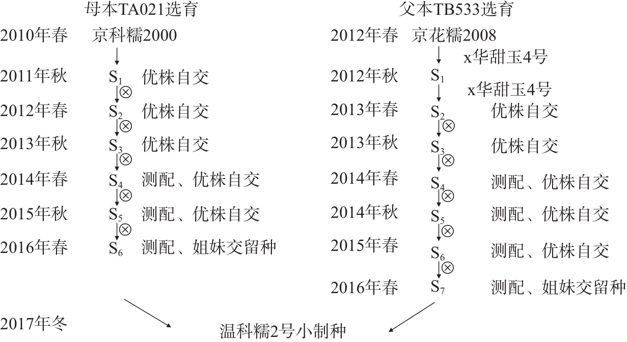 甜加糯玉米是我国首创的鲜食玉米新类型,兼具甜玉米和糯玉米的风味优点,口感甜糯相宜,近年来深受市场欢迎,已成为鲜食玉米产业的重点发展方向。温州市农业科学研究院旱粮育种团队自2010年起开展甜加糯玉米种质创新和品种选育,采用异隐纯合体杂交(糯玉米×甜糯玉米)模式,并通过多年田间表型鉴选和籽粒糖度、食用品质等鉴定评价,成功选育出甜加糯玉米温科糯2号。该品种具有高产稳产、配合力强、生育期短、品质优良等特点。于2018—2019年春季参加糯玉米品比试验,于2021—2022年参加东南区鲜食糯玉米联合体区域试验,平均667 m2产量为1 161.15 kg,比对照增产21.61%,并于2023年通过国家审定。本文系统介绍了温科糯2号的选育过程、特征特性及配套栽培技术,以期为该品种的推广提供技术指导。