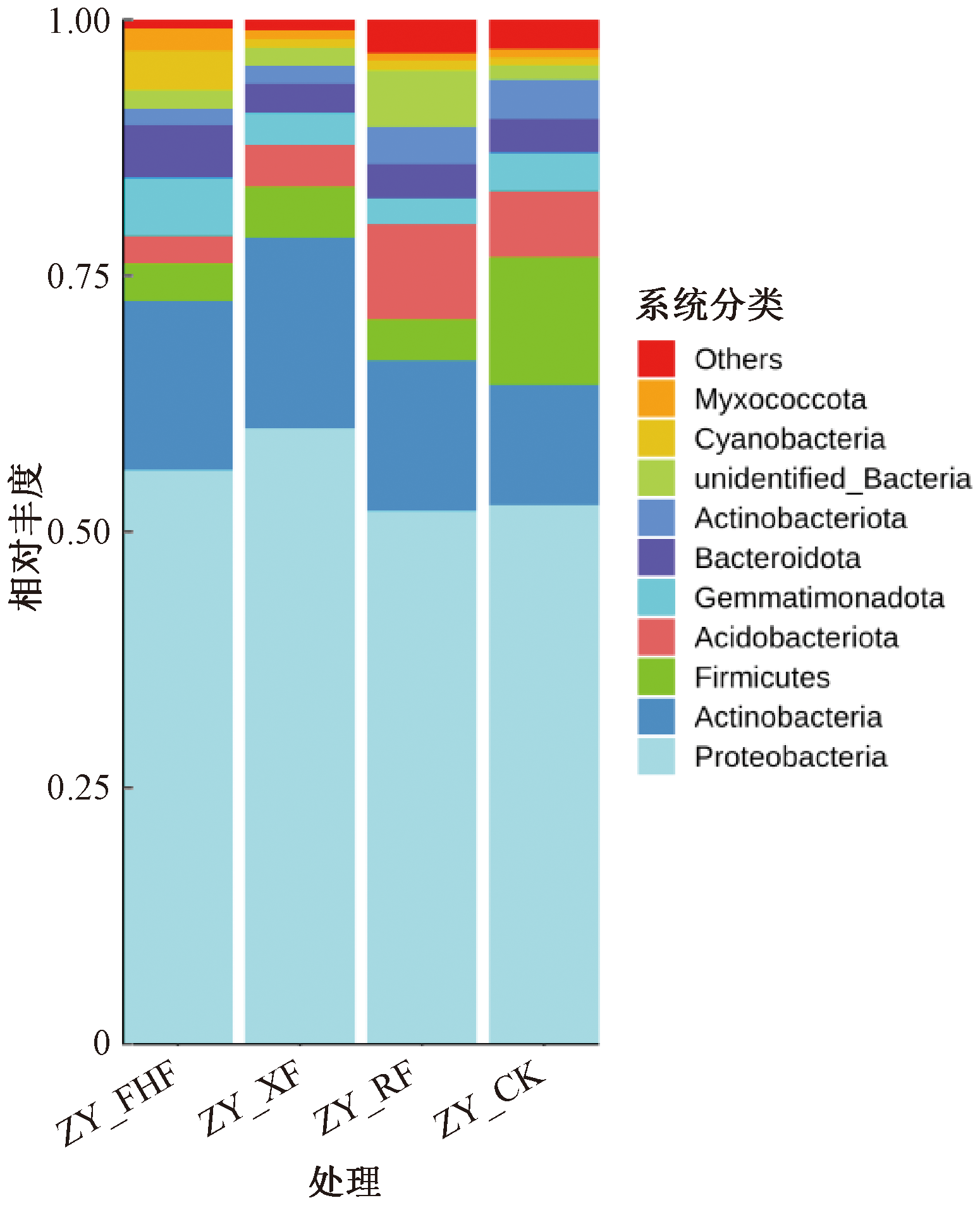 图4 不同处理茶园土壤微生物的相对丰度(门水平) Others,其他;Myxococcota,黏细菌门;Cyanobacteria,蓝藻门;Acitinobacteriota,放线菌门;Bacterioidota,拟杆菌门;Gemmatimonadota,芽单胞菌门;Acidobacteriota,酸杆菌门;Firmicutes,厚壁菌门;Acitinobacteria,放线菌纲;Proteobacteria,变形菌门;unidentified_Bacteria,未定义细菌门。