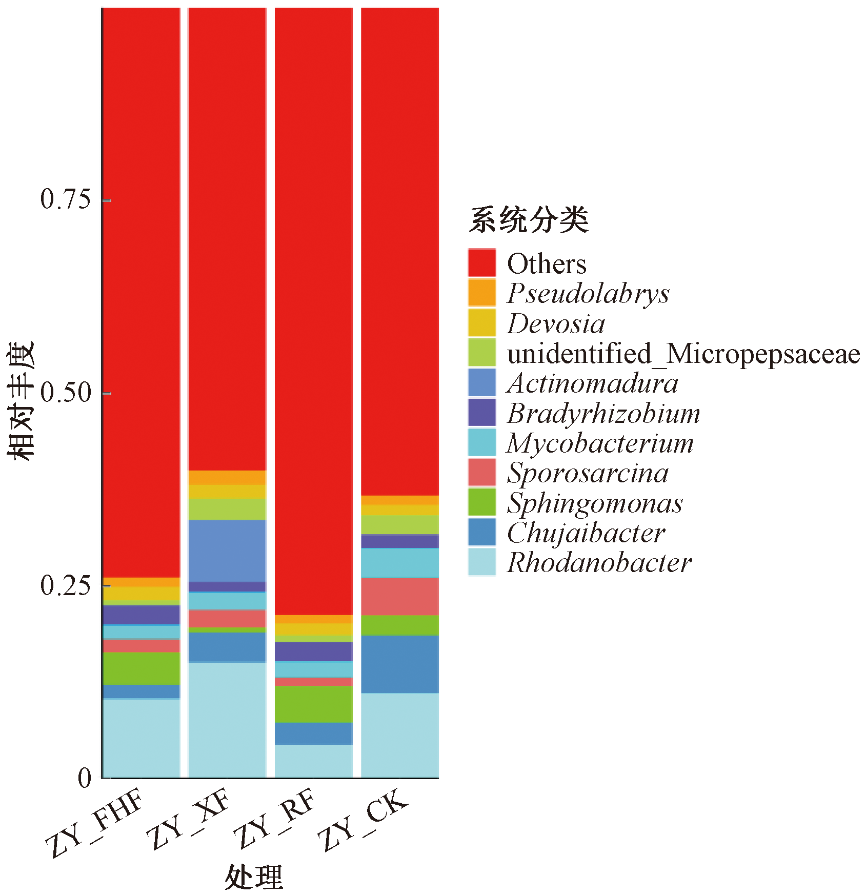 图5 不同处理茶园土壤微生物的相对丰度(属水平) Pseudolabrys,假双斧状菌属;Devosia,德沃斯氏菌属;Unidentified-Micropepsaceae,未定义Micropepsaceae科菌属;Actinomadura,马杜拉放线菌属;Bradyrhizobium,慢生根瘤菌属;Sporosarcina,芽孢八叠球菌属;Mycobacterium,分枝杆菌属;Sphingomonas,鞘氨醇单胞杆菌属;Chujaibacter,诸氏杆菌属;Rhodanobacter,罗河杆菌属。