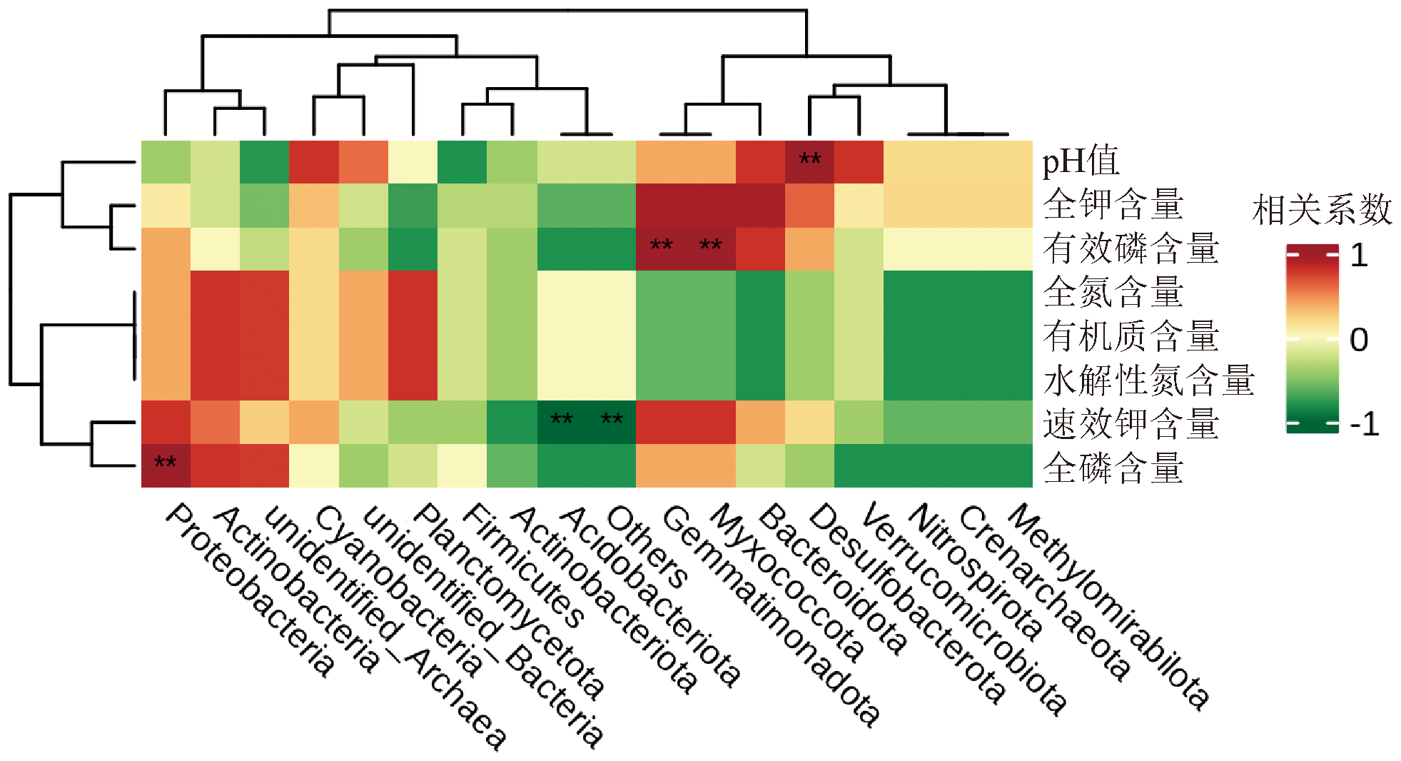图6 不同施肥处理下土壤理化性质与细菌门的Spearman相关性热图 “**”表示极显著水平p<0.01,图7同。Proteobacteria,变形菌门;Acitinobacteria,放线菌纲;Unidentified_Archaea,未定义古菌门;Cyanobacteria,蓝藻门;Unidentified_Bacteria,未定义细菌门;Planctomycetota,浮霉菌门;Firmicutes,厚壁菌门;Actinobacteriota,放线菌门;Acidobacteriota,酸杆菌门;Others,其他菌门;Gemmatimonadota,芽单胞菌门;Myxococcota,黏细菌门;Bacterioidota,拟杆菌门;Desulfobacterota,脱硫细菌门;Verrucomicrobiota,疣微菌门;Nitrospirota,硝化螺旋菌门;Crenarchaeota,泉古菌门;Methylomirabilota,甲基胞囊菌门。