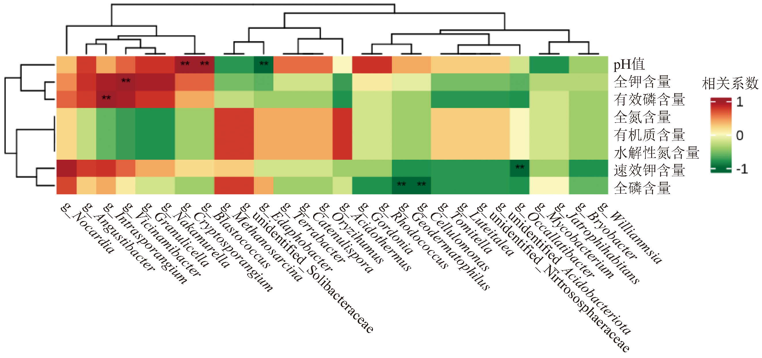 图7 不同施肥处理下土壤理化性质与细菌属的Spearman相关性热图 Nocardia,诺卡氏菌属;Angustibacter,窄杆菌属;Intrasporangium,孢囊放线菌属;Vicinamibacter,近缘杆菌属;Granulicella,窄杆菌属;Nakamurella,中村菌属;Cryptosporangium,隐孢囊菌属;Blastococcus,芽球菌属;Methanosarcina,甲烷八叠球菌属;unidentified_Solibacte raceae,未定义;Edaphobacter,土杆菌属;Terrabacter,地杆菌属;Catenulispora,链孢囊菌属;Oryzihumus,米土菌属;Acidothermus,酸热菌属;Gordonia,戈登氏菌属;Rhodococcus,红球菌属;Geodermatophilus,地嗜皮菌属;Cellulomonas,纤维单胞菌属;Tomitella,Tomitella属;Luteitalea,Luteitalea属;Unidentified-Nirtrososphaeraceae,未定义硝化球菌科菌属;Occallatibacter,河岸杆菌属;Mycobacterium,分枝杆菌属;Jatrophihabitans,Jatrophihabitans属;Bryobacter,苔藓杆菌属;Willianmsia,威廉姆斯氏菌属。