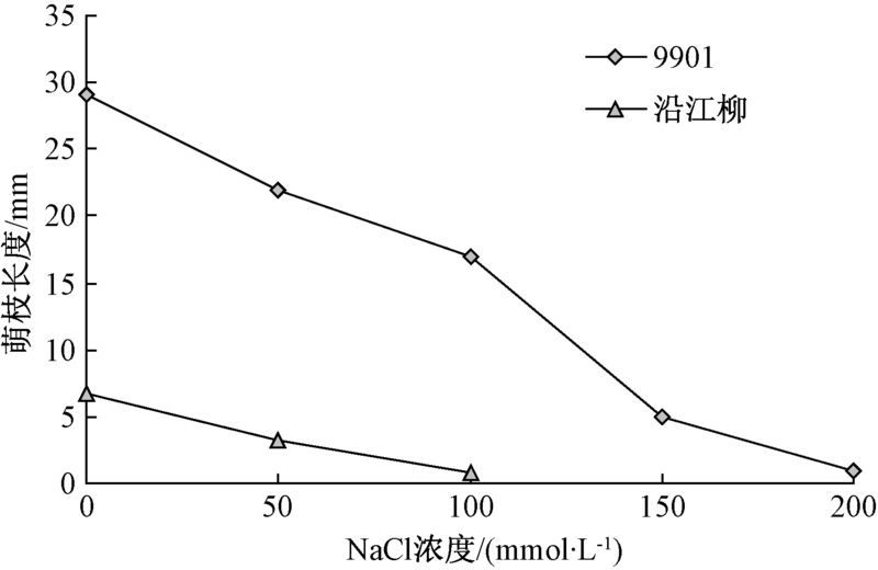 由图1可知, 9901和沿江柳的萌枝长度在NaCl溶液胁迫下随浓度的增加均呈下降趋势, 但在各NaCl浓度胁迫下, 9901的萌枝长度均明显高于沿江柳。NaCl浓度为200 mmol· L-1时, 9901萌枝长度降至最低为1 mm, 且叶片也开始发黄; NaCl浓度为100 mmol· L-1时, 沿江柳萌枝长度只有0.8 mm; NaCl浓度为150 mmol· L-1, 已停止萌枝。说明盐胁迫抑制萌枝生长, 而9901较沿江柳更耐受盐的胁迫。