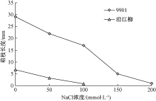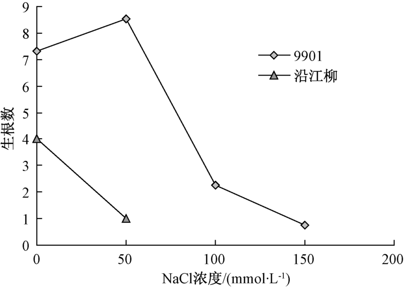 在NaCl溶液胁迫下, 柳树根的生长受到抑制。图2表明, 2个柳树品种的平均生根数随着NaCl溶液浓度增加而下降至不生根。NaCl浓度为50 mmol· L-1时, 9901平均生根数最多为8.54, 且随着NaCl浓度的增加而下降; 当NaCl浓度为150 mmol· L-1时, 平均生根数降至0.75; 当NaCl浓度为200 mmol· L-1时, 停止生根。沿江柳随NaCl溶液浓度的增加呈逐渐下降的趋势。NaCl浓度为50 mmol· L-1时, 生根数比无NaCl溶液下降75%; 当NaCl浓度为100 mmol· L-1时, 停止生根, 且9901在NaCl浓度为100 mmol· L-1时比沿江柳在NaCl浓度为50 mmol· L-1时生根数多55.6%, 说明生根数与柳树苗期耐盐性具有相关性, 可作为鉴定柳树苗期耐盐性的形态指标。可见9901较沿江柳耐盐能力强。