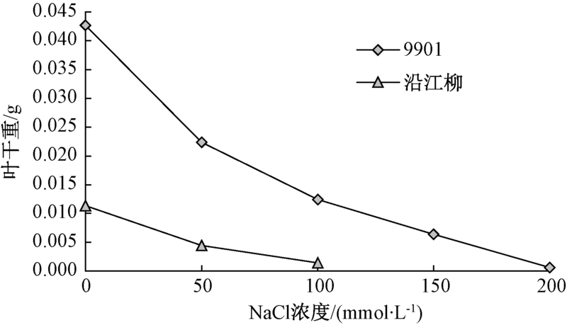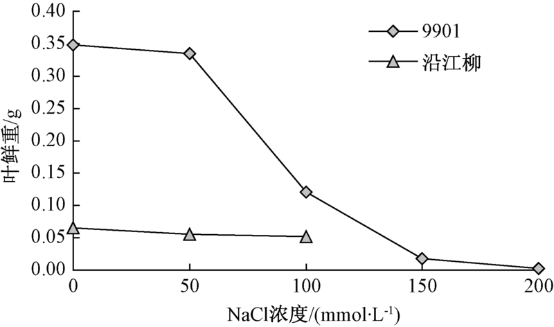 图4表明, 在不同浓度NaCl胁迫下, 柳树亲本的叶鲜重随着NaCl溶液浓度的增加呈逐渐下降的趋势。但在各浓度NaCl溶液处理条件下, 9901的长势较沿江柳有优势, 叶鲜重均明显高于沿江柳, 说明盐胁迫严重影响了沿江柳叶鲜重的积累, 而对9901叶鲜重积累影响比沿江柳较小。但当NaCl浓度达到200 mmol· L-1时, 9901只有少量叶片且发黄, 说明9901耐盐能力较沿江柳强。
