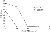 柳树品种在NaCl溶液的胁迫下的总根长随着浓度的增加呈逐渐下降的趋势。图3显示, 在NaCl浓度为150 mmol· L-1时, 9901还能生根, 但总根长度下降到最小值, 为1 mm; 当NaCl浓度继续升至200 mmol· L-1时, 9901已停止生根。而沿江柳在NaCl浓度为50 mmol· L-1时, 最长根长度下降到最小值, 比9901在NaCl浓度为100 mmol· L-1时的最长根降低46.6%, 并且沿江柳在NaCl浓度为100 mmol· L-1时停止生根。可见, 盐胁迫下, 抑制了柳树根系的生长, 沿江柳较9901受盐胁迫抑制程度更高。