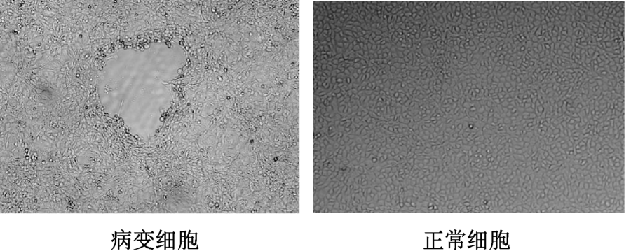 不同稀释度的病毒液接种后4 d, 出现明显的细胞病变现象, 单层细胞呈破网状(图1)。共制得300 mL病毒液, 混合后, 采用Reed-Muench法计算病毒滴度, 结果为108.125 TCID50· mL-1。