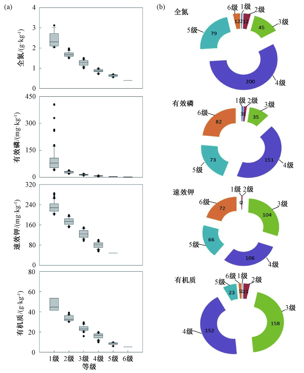 参照第二次全国土壤普查推荐的土壤肥力分级标准, 将土壤有机质和主要养分含量各分为6个等级。